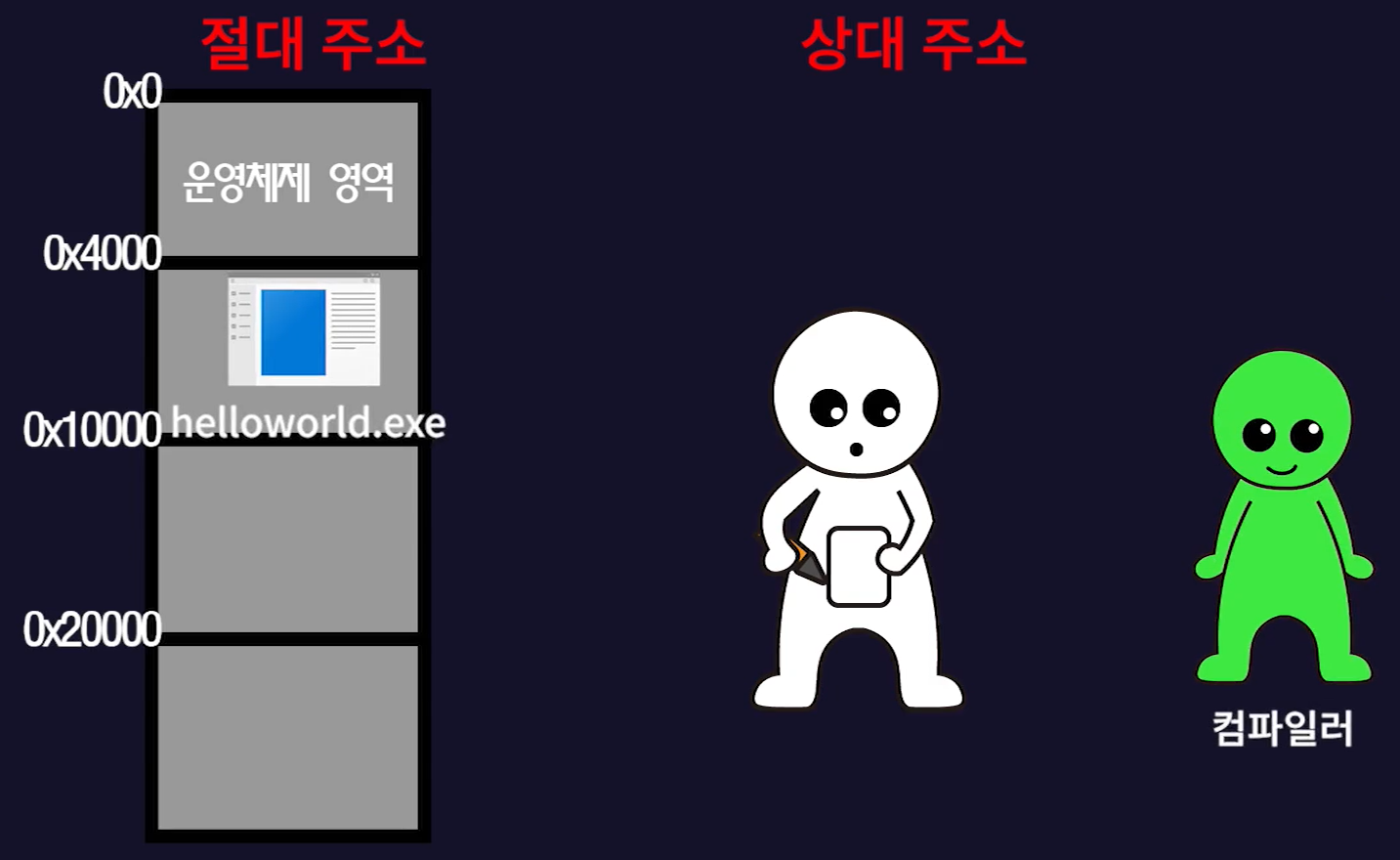 - 메모리에는 절대주소와 상대주소라는 개념이 있다.