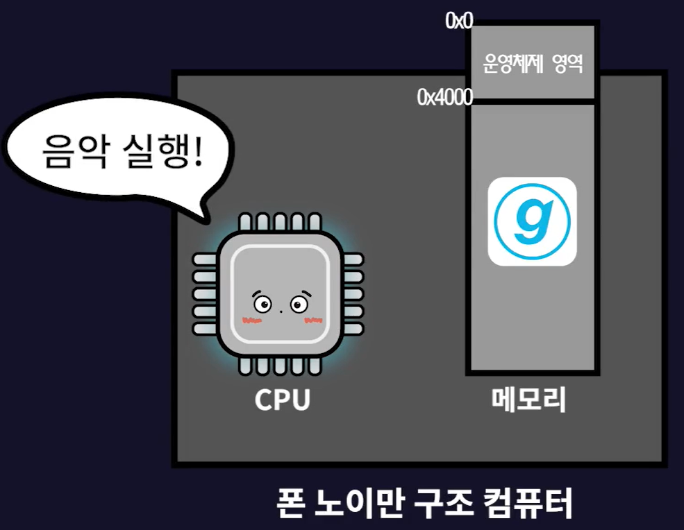 - 오늘날 컴퓨터는 폰 노이만 구조로 되어있고 폰 노이만 구조는 모든 프로그램을 메모리에 올려서 실행시킨다.
