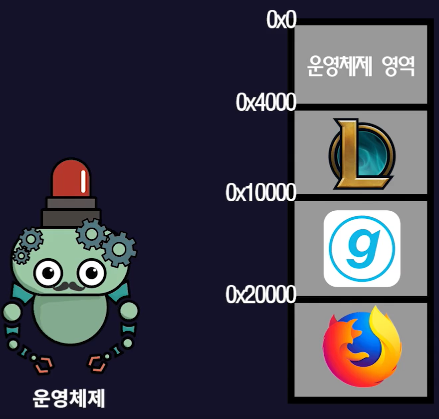 - 메모리에는 운영체제와 수 많은 프로세스들이 올라온다. 그 중 운영체제는 특별하기 때문에 운영체제를 위한 공간은 따로 마련해둔다.