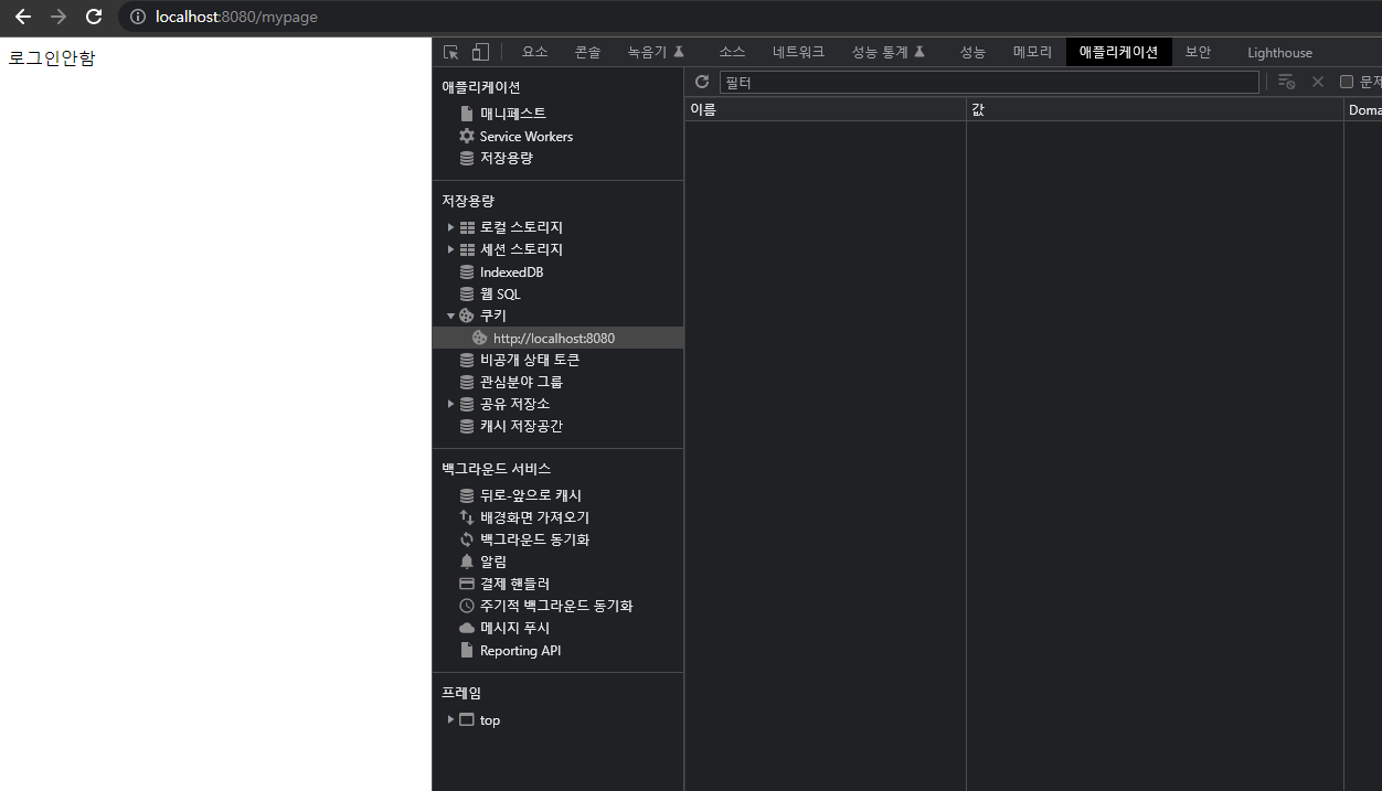 cf) 로그아웃을 하고 싶다면 [ F12(개발자도구) - Application 탭 - 좌측 Cookies ]에서 직접 쿠키를 삭제하면 된다.