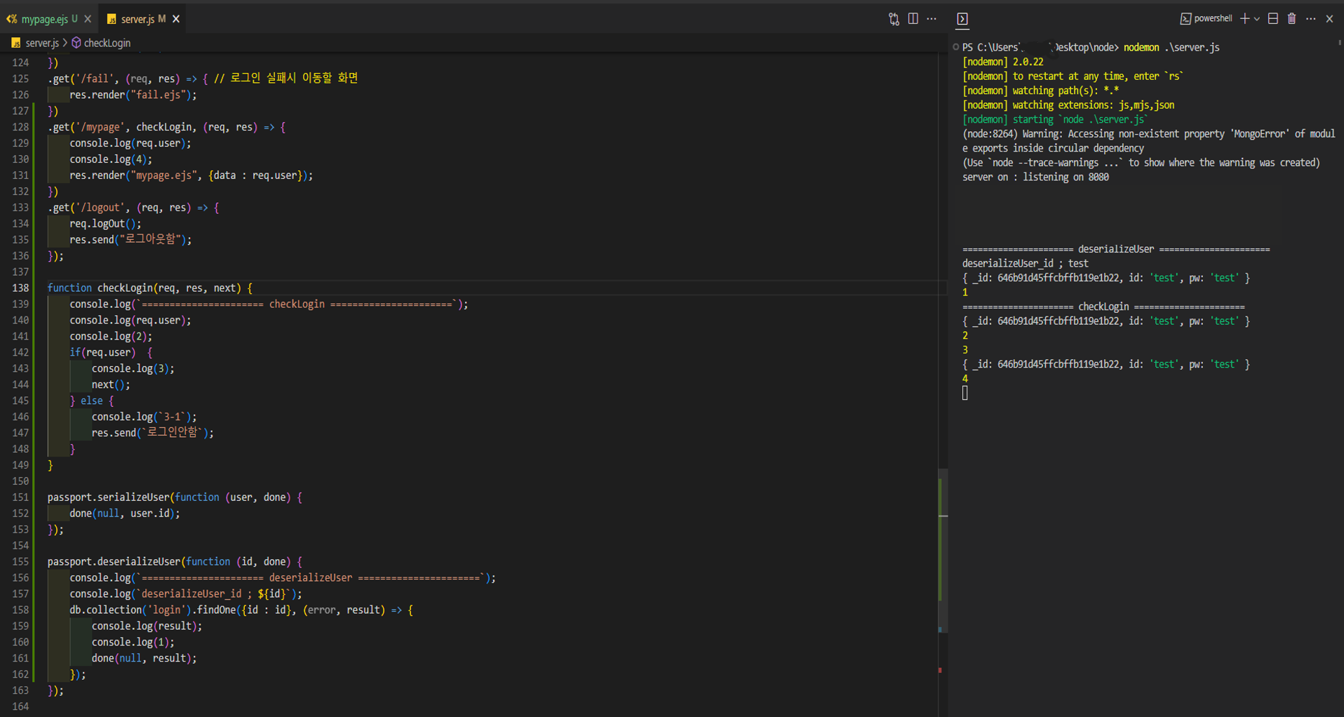 2. 그러면 /mypage 요청과 mypage.ejs 응답 사이에 checkLogin function을 실행시켜준다.