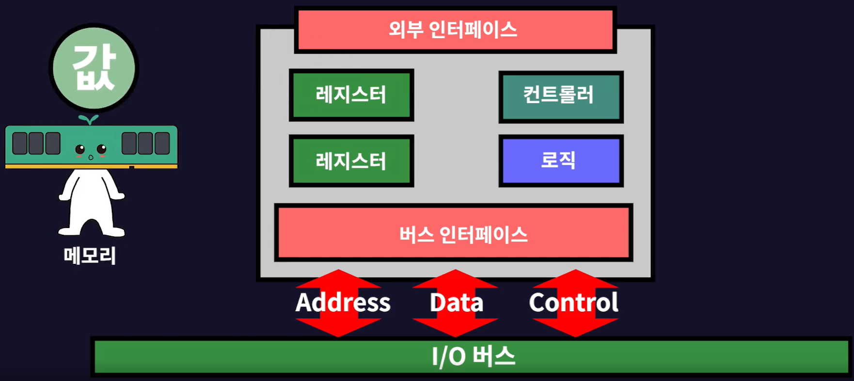 - 그래서 I/O 디바이스(입출력 디바이스)는 위 3가지의 버스를 따로 받을 수 있다.