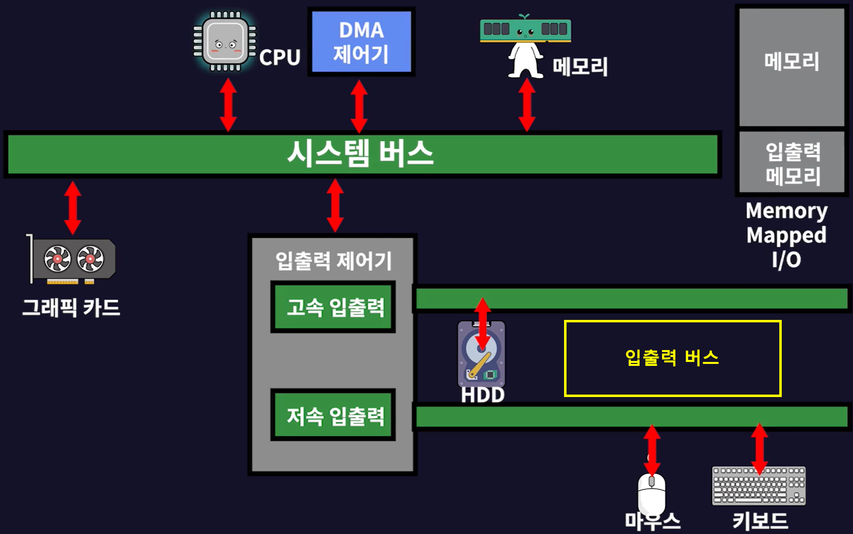 - 입출력 버스는 세부적으로 느린장치(마우스, 키보드 등)와 빠른장치(HDD)를 구분하기 위해 (고속 입출력 버스와 저속 입출력 버스) 2개의 채널로 나뉘어진다.