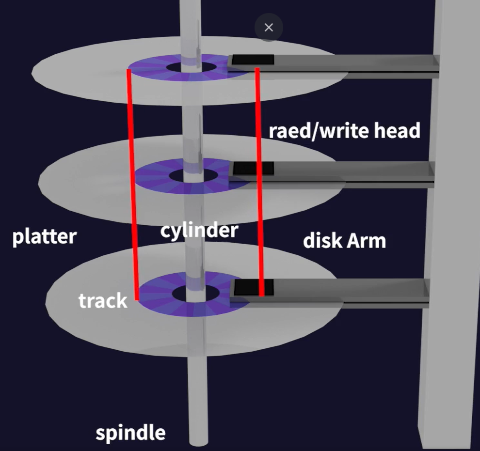 - 헤드가 움직이면 이 헤드들은 여러 개의 플래터를 가리키게 되는데 이때 여러 개의 플래터에 있는 같은 트랙의 집합을 실린더(cylinder)라고 부른다.(복수의 플래터 트랙을 수직으로 관통하는 것이 실린더라고 생각하면 된다.)