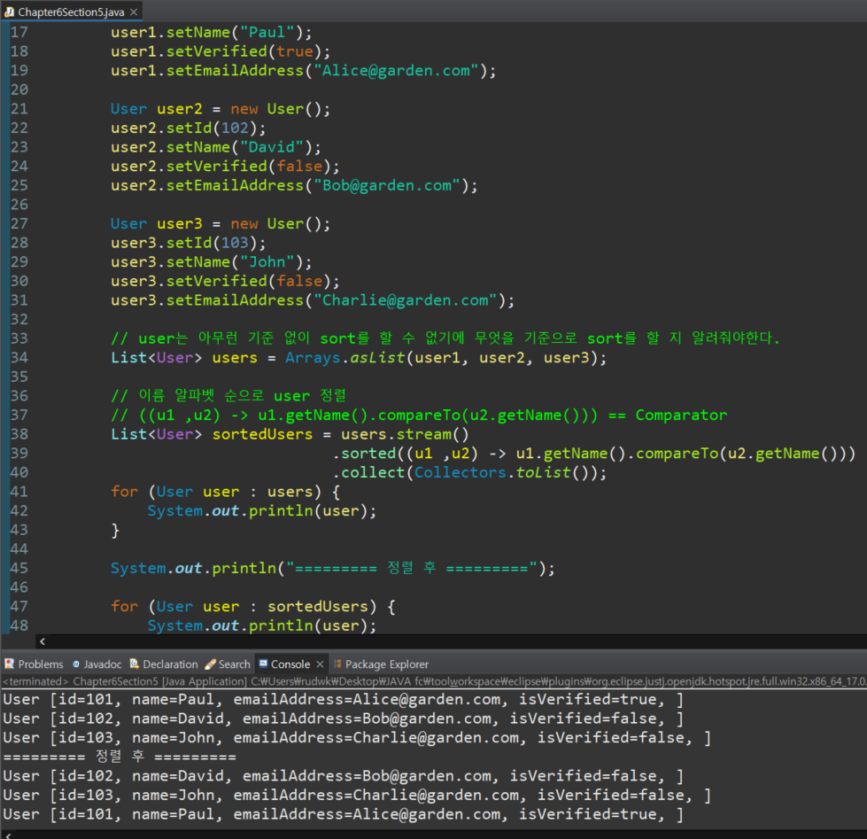System.out.println("========= 정렬 후 =========");