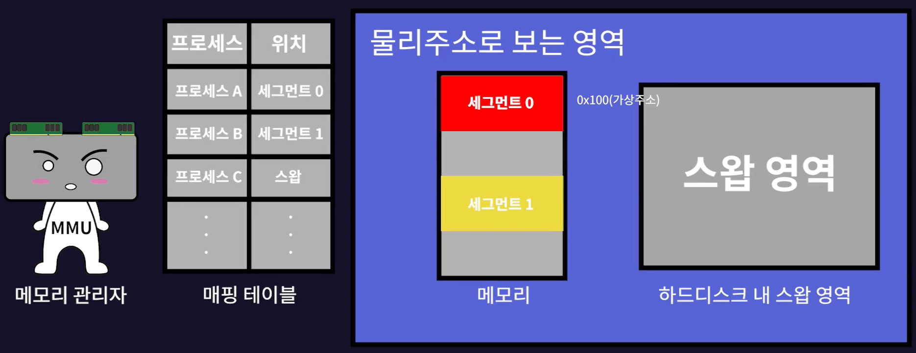 - 매핑 테이블에 따르면 프로세스 A는 물리 메모리의 세그먼트 0에 위치하고 프로세스 B는 물리 메모리의 세그먼트 1에 존재한다.