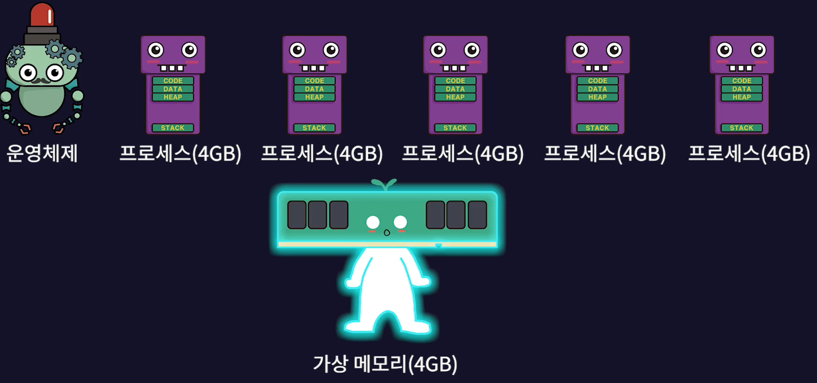 - 이때 가상메모리 시스템은 물리 메모리 내용의 일부를 하드 디스크(HDD)에 있는 스왑 영역으로 옮긴 후 처리가 필요할 때 물리 메모리로 가져와 실행시키기 때문에 프로세스 5개와 운영체제를 전부 실행시킬 수 있다.