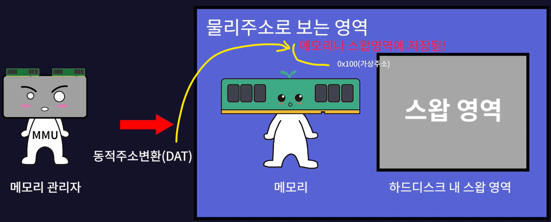 - 메모리 관리자는 물리 메모리와 스왑영역을 합쳐 프로세스가 사용하는 가상주소를 물리주소로 변환하는데 이것을 동적주소변환(DAT, Dynamic Address Translation)이라고 부른다.