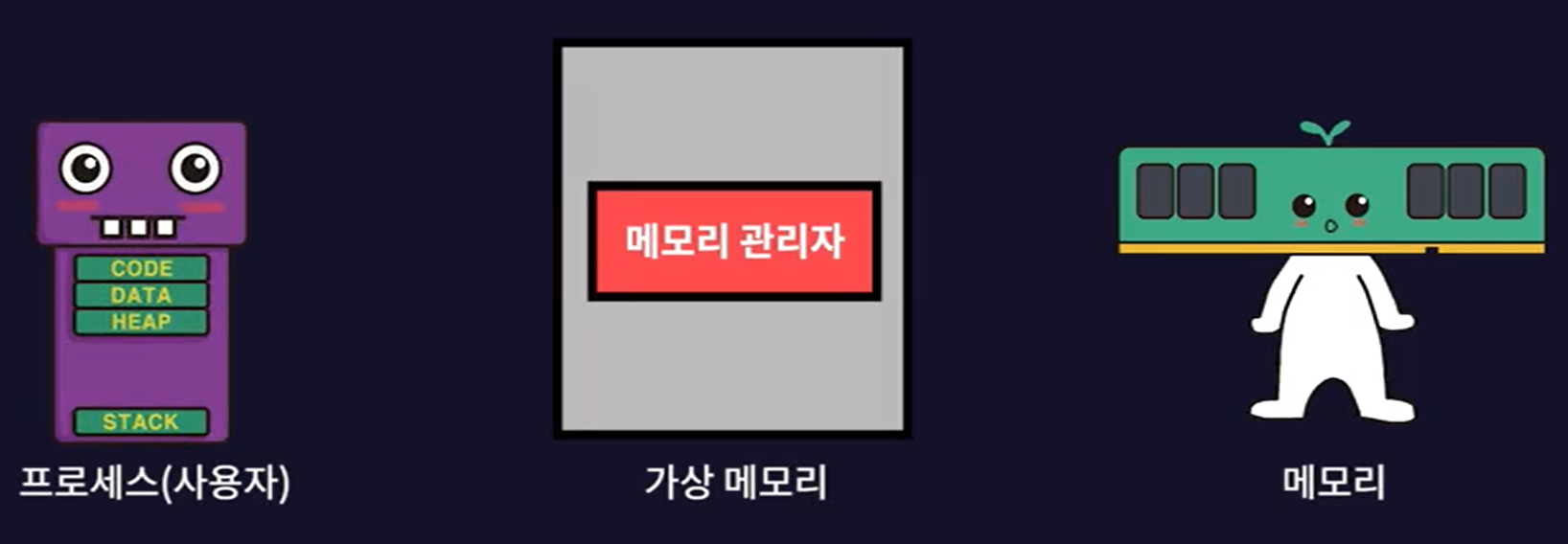 - 메모리 관리자는 프로세스의 요청이 있으면 그에 맞는 물리 메모리로 연결시켜준다.
