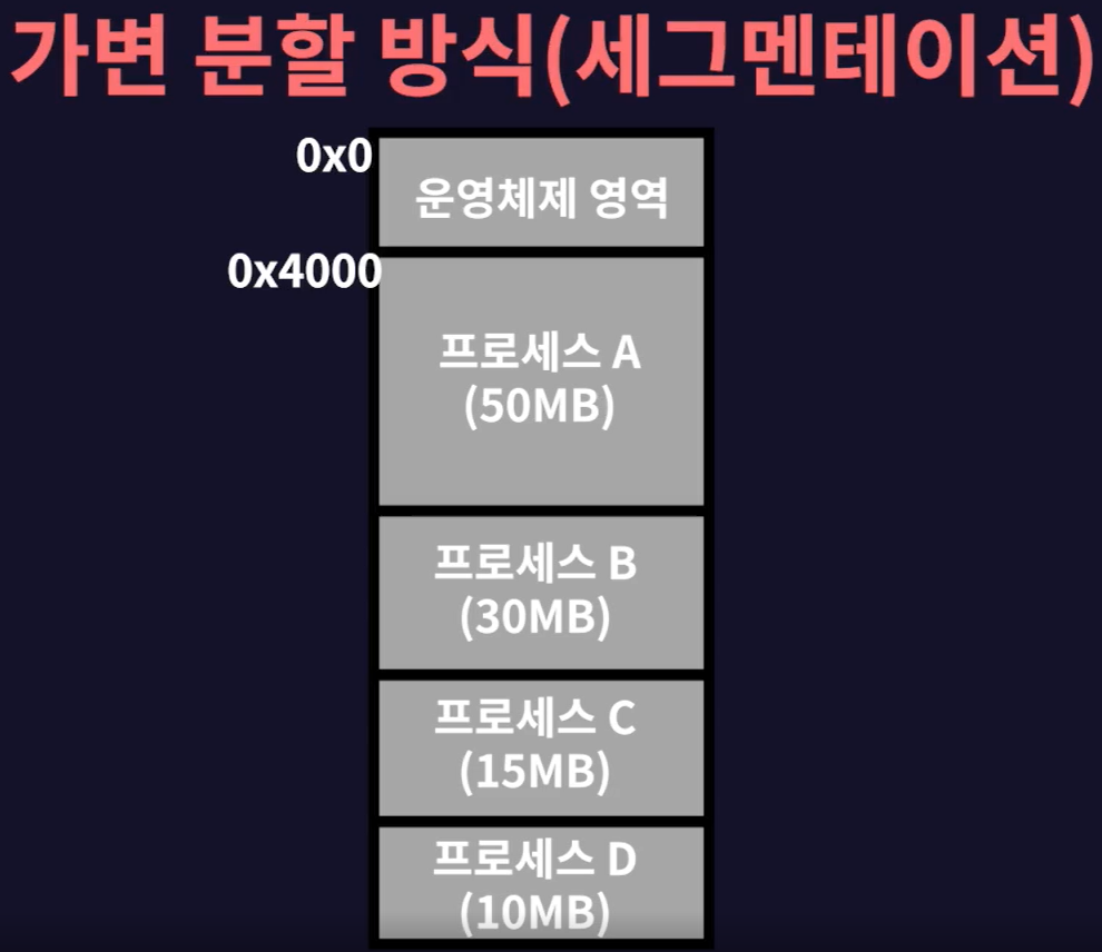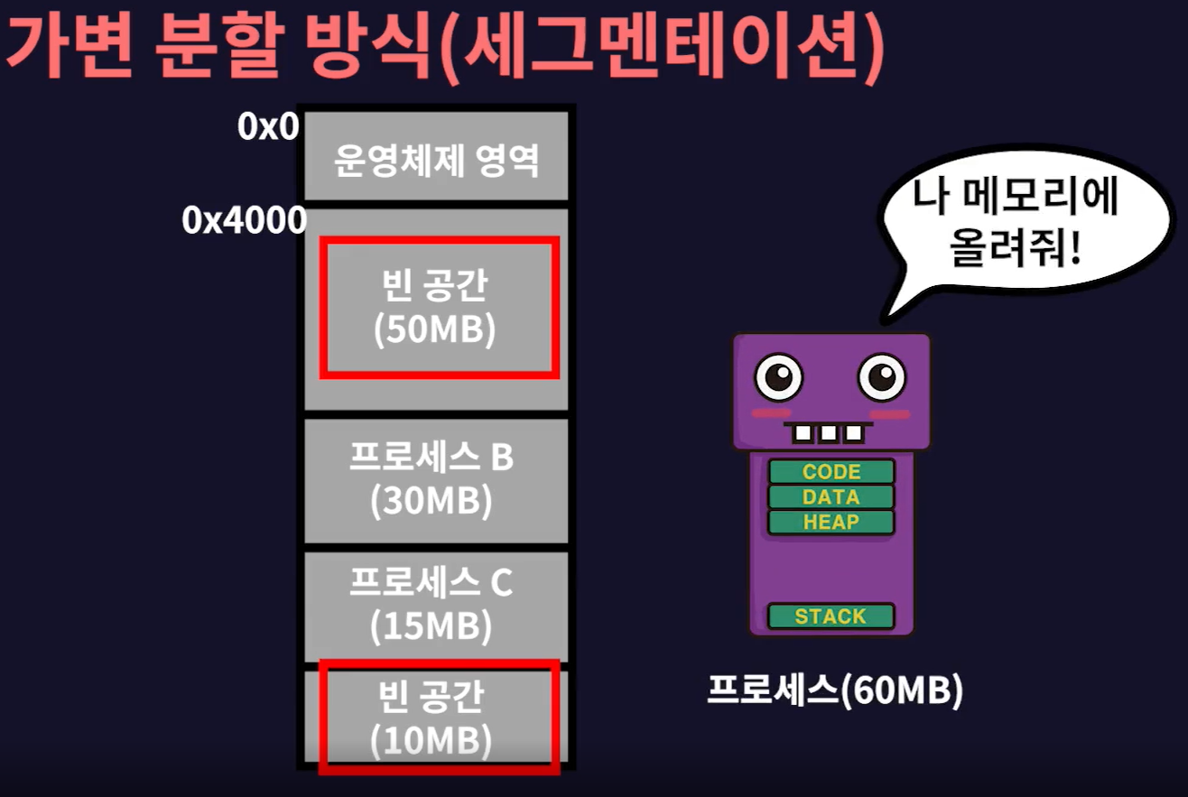 1. 가변 분할 방식(연속 메모리 할당, 세그멘테이션)