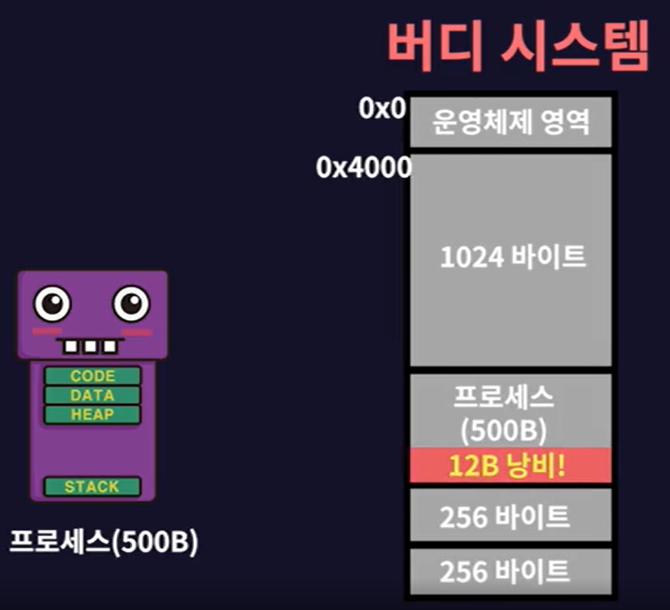 - 2048 byte를 2로 3번 나누면 256 byte가 되는데 이러면 500 byte 프로세스를 올릴 수 없으므로 256 byte 보다 더 큰 구역인 512 byte에 500 byte 프로세스를 할당한다.