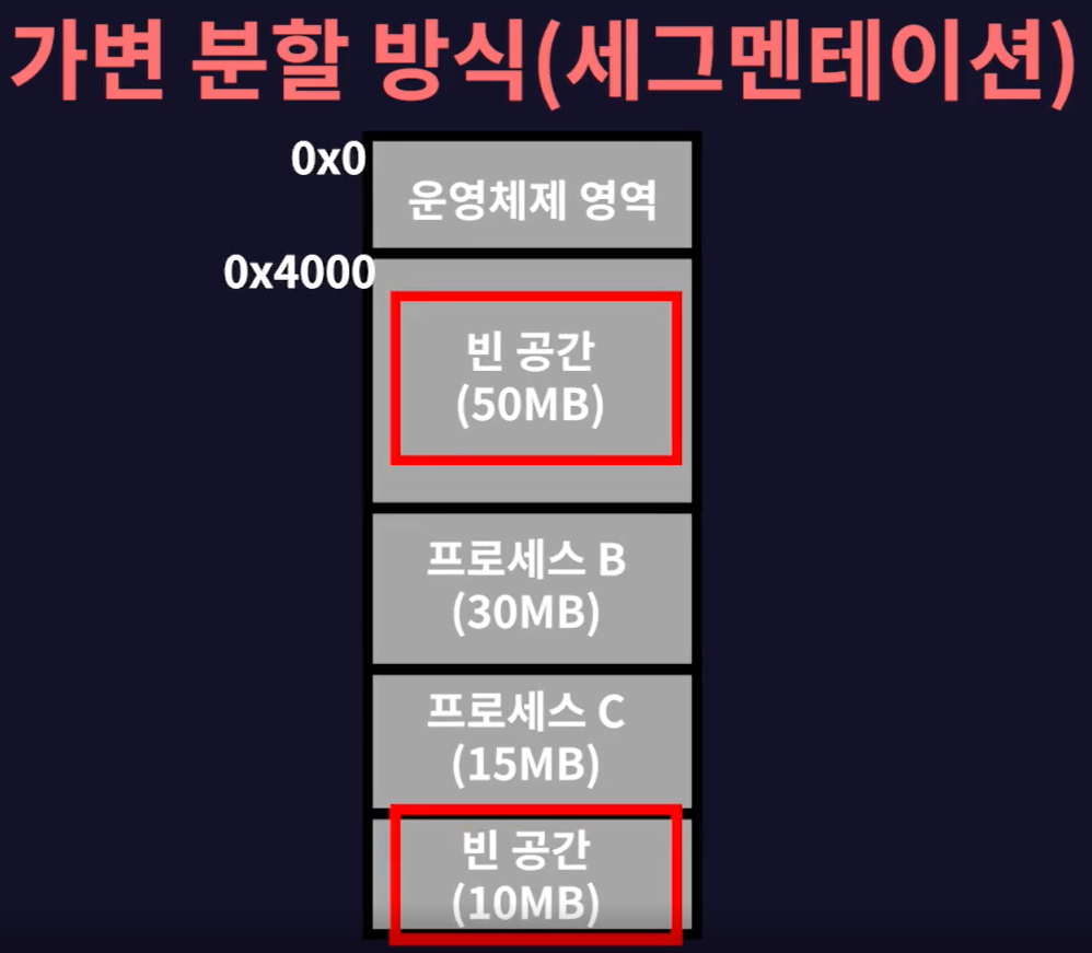 - 그러나 가변 분할 방식은 메모리의 연속된 공간에 프로세스를 할당하는 기법이므로 결국 60MB 프로세스에게 메모리를 할당할 수 없는 상황이 발생한다. 이것을 외부 단편화라고 한다.
