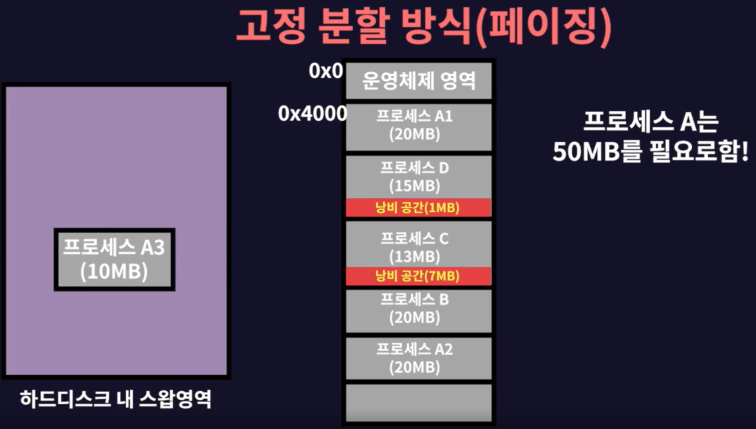 - 5MB인 프로세스 A는 2MB로 나눈 구역 3개에 나눠서 할당된다.(1MB는 빈 공간이 된다.)