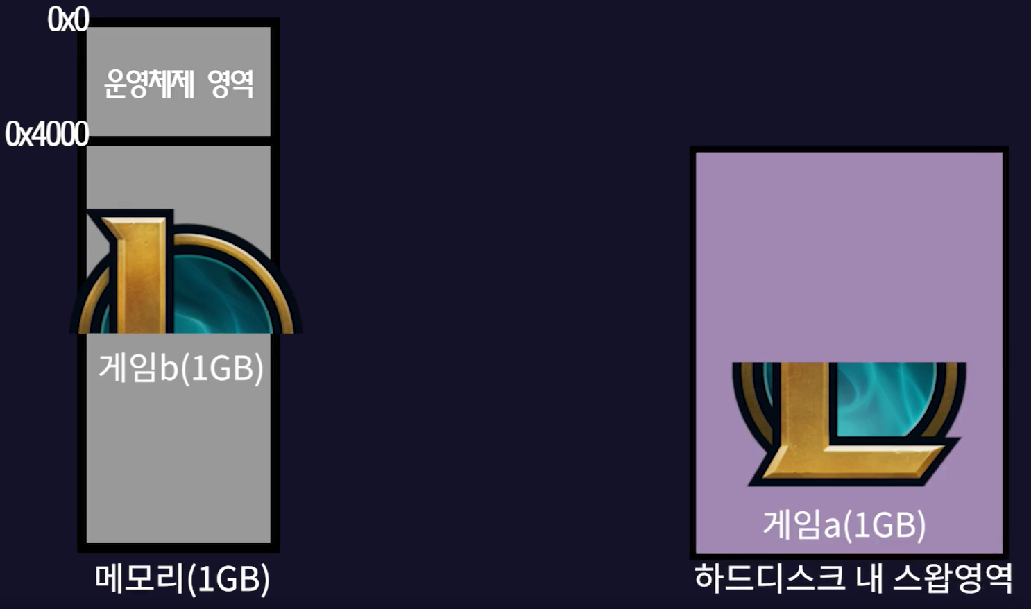 ex) 9GB의 프로그램 중 1GB만 메모리에 올리고 나머지 8GB를 스왑영역에 저장하면 사용자는 마치 메모리의 크기가 9GB인 것처럼 느낄 것이다.