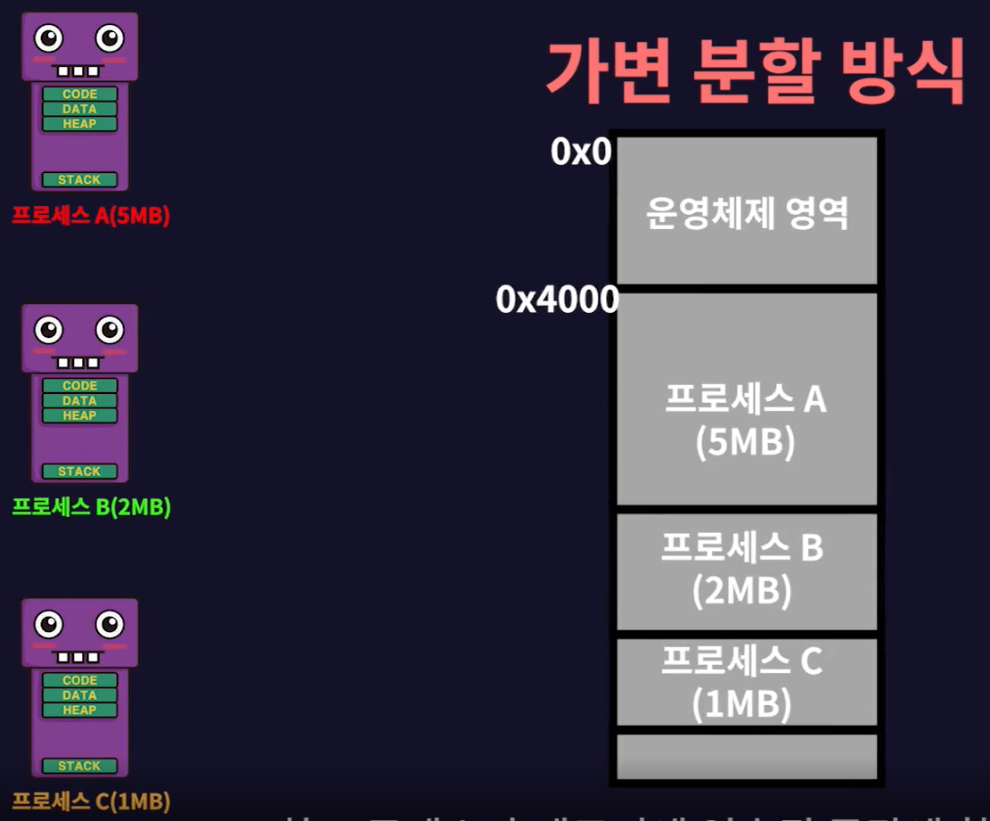 - 프로세스의 크기에 따라 메모리의 크기가 결정되므로 메모리에 각각 프로세스 A, B, C를 위한 공간을 마련한다.