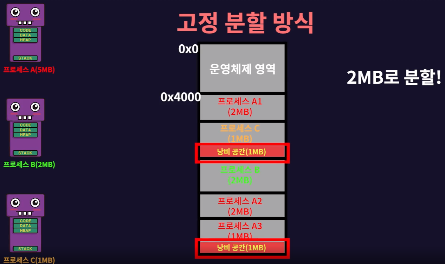 - 프로세스의 크기와 상관없이 메모리를 정해진 크기로 할당, 해당 예시에서는 크기가 2MB로 정해져 있다고 해보자