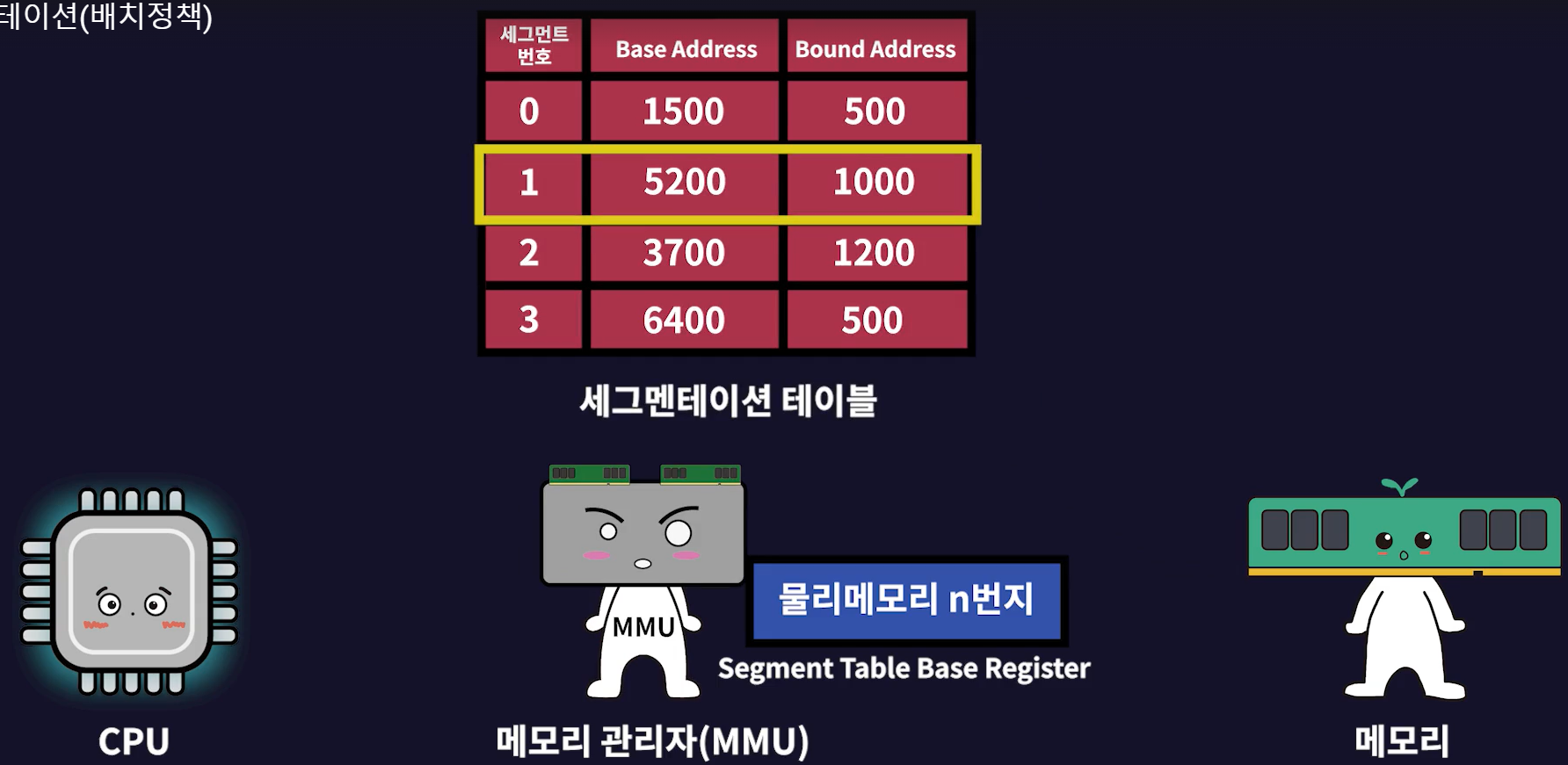 - MMU 내에 있는 Segment Table Base Register를 이용해서 세그멘테이션 테이블을 찾아낸다.(물리 메모리 n번지에 있는 세그멘테이션 테이블 소환)