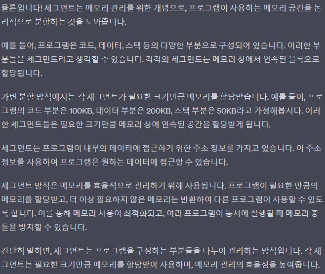 - 세그멘테이션은 메모리를 가변적으로 분할할 수 있고 코드 영역, 데이터 영역, 힙 영역, 스택 영역을 모듈로 처리할 수 있기 때문에 공유와 각 영역에 대한 메모리 접근 보호가 편리하다.(영역별로 분할돼서 관리가 쉽다.)