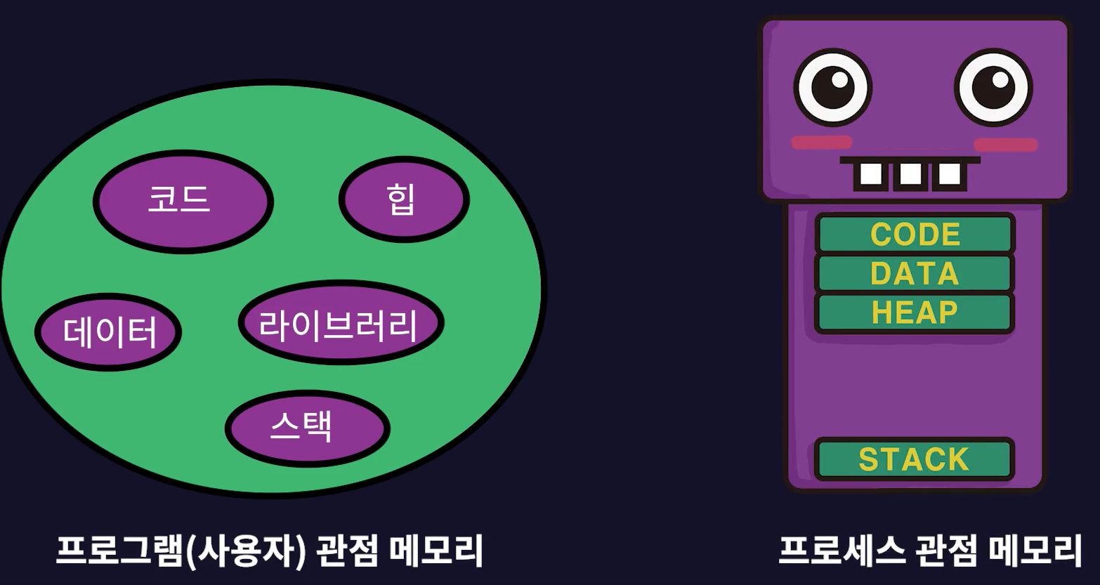 - 반면에 프로세스 관점에서는 코드 영역, 데이터 영역, 힙 영역, 스택 영역 등이 서로 인접한 것 처럼 바라본다.