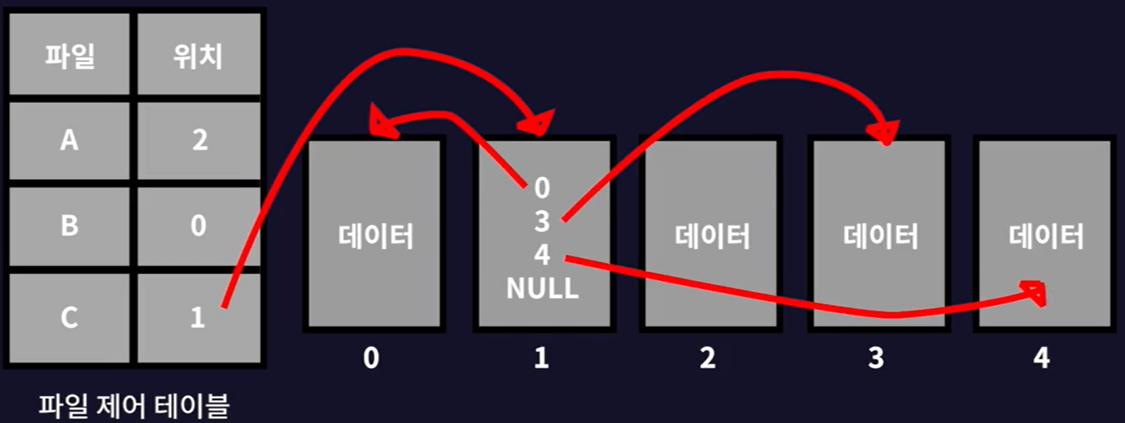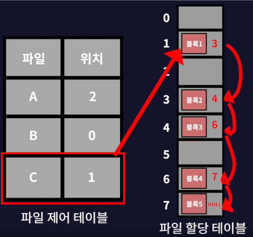 - 즉, 파일 테이블에는 시작 블록에 대한 정보만 저장하고 나머지는 연결리스트를 이용해 다른 블록에 접근하는 방식이다.