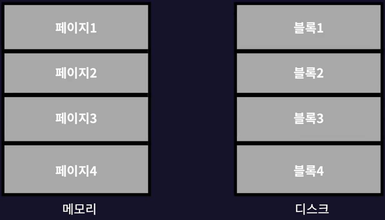 - 일정한 크기로 나눈 공간을 메모리에서는 페이지라고 부르고 파일 시스템에서는 블록이라고 한다.(한 블록의 크기는 1~8kb)