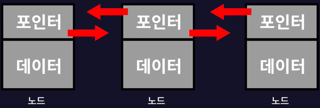 - 연결리스트는 각 노드가 데이터와 포인터를 가지고 있는데 데이터는 해당 노드가 저장하고 있는 데이터이고 포인터는 이전 노드와 다음 노드의 주소를 가리킨다.