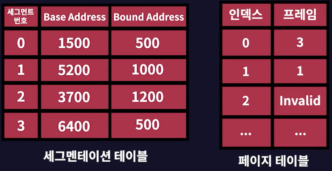 1. 세그멘테이션 기법에서 세그멘테이션 테이블은 Base Address와 Bound Address로 구성되어 있다.