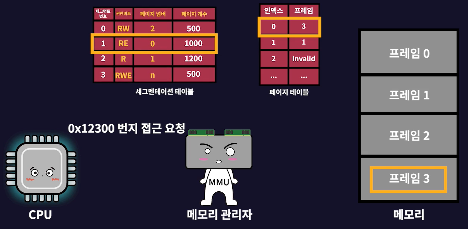 3. 0x12300 번지이니 1번 세그먼트이므로 세그멘테이션 테이블의 1번 인덱스를 참조한다.