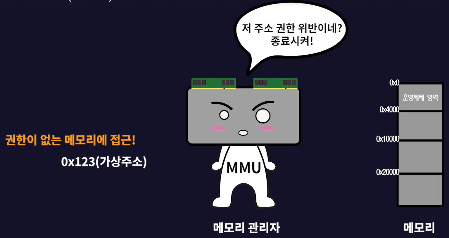 - 만약 권한을 위반한다면 메모리 관리자(이하 MMU)가 에러를 발생시킨다.
