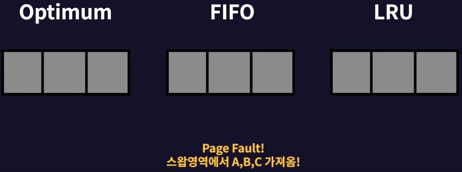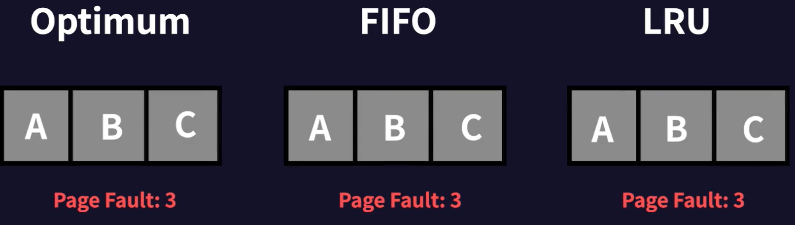 - 역시 FIFO, Optimum, LRU 모두 현재 메모리에 페이지 C가 있기에 page fault가 발생하지 않는다.