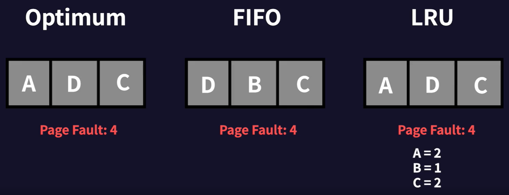 - FIFO, Optimum, LRU 모두 현재 메모리에 페이지 A가 있기에 page fault가 발생하지 않는다.