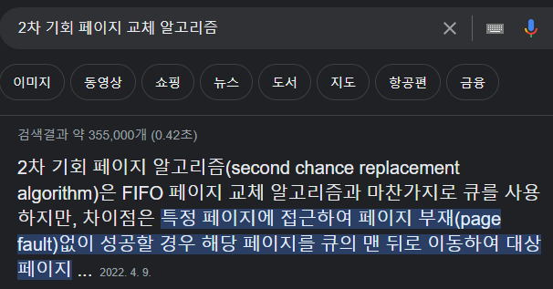 - 2차 기회 페이지 교체 알고리즘의 성능은 LRU 보다는 안 좋고 FIRO 보다는 좋다.