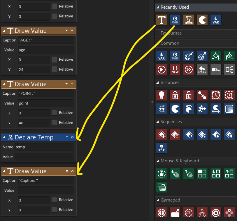 cf) Draw와 관련된 액션 아이콘의 색상은 황토색으로 표시, 해당 색상의 액션들은 오직 Draw 이벤트에서만 작동한다.
