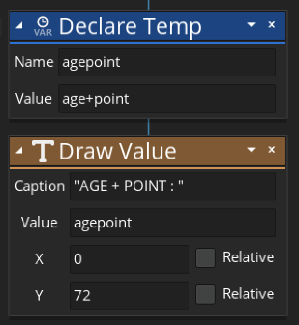 - 위에서 본 Draw 이벤트에 Declare Temp action, Draw Value action을 하나씩 더 추가해보자