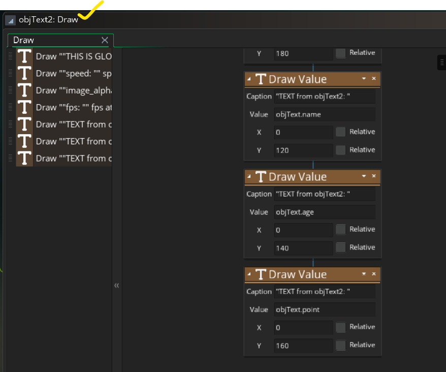 - objText2에 Draw 이벤트를 추가해 전역변수를 출력해보자. Get Global Variable을 이용해 선언한 전역변수를 가져올 수 있다.(선언한 전역변수의 Name을 Target에 불러오는 기능 수행)