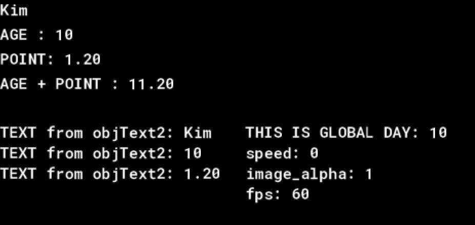 - objText의 Create Event에서 선언한 변수 3개(name, age, point)를 다른 오브젝트인 objText2에서 출력해보자