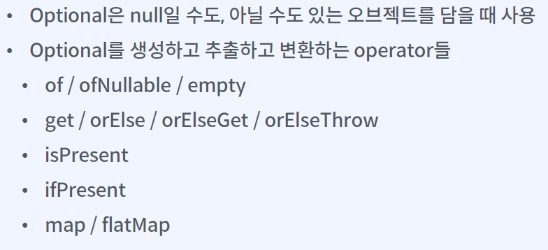 - 어떤 method의 return type이 Optional이라면 해당 return 값 안에 object가 있을 수도 or 없을 수도 있다고 예상할 수 있다.