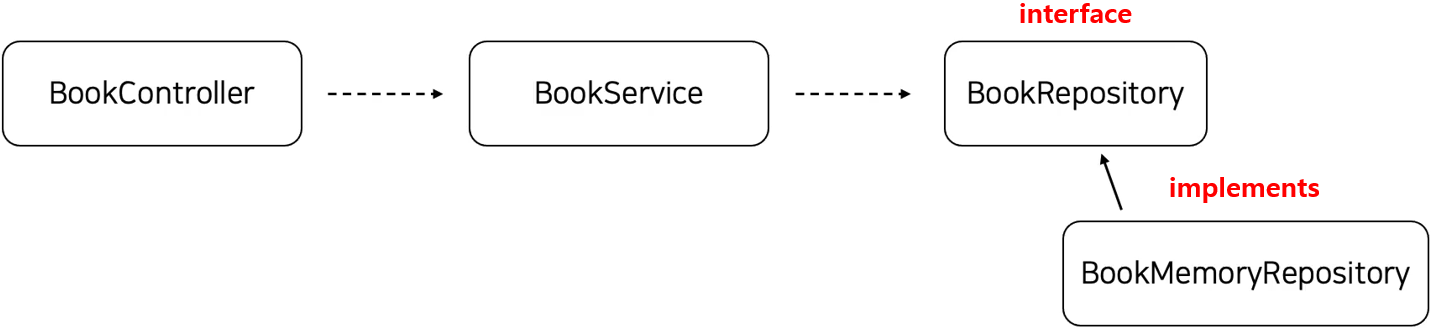 - BookService는 BookRepository interface를 사용하고 BookMemoryRepository가 해당 interface를 구현하는 방식이다.