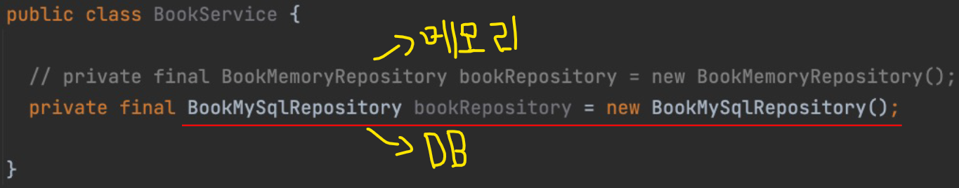 - 이런 상황(메모리 → DB로 저장 위치 변경)이라면 BookService의 코드는 아래와 같이 변경될 것이다.