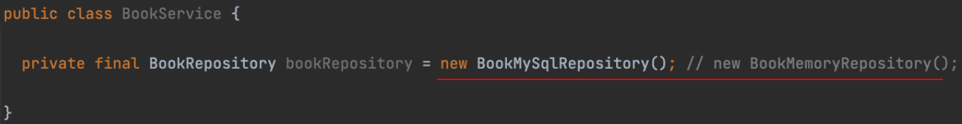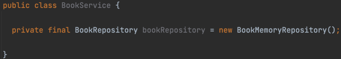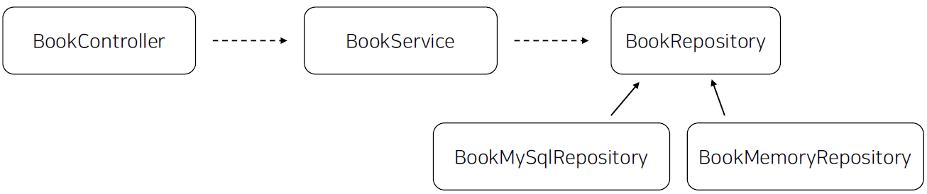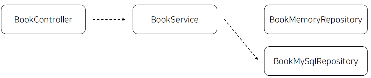 - 위의 예에서는 BookMemoryRepository를 BookService 딱 한 곳에서만 사용하지만 만약 BookMemoryRepository를 더 많은 Service 계층에서 사용중이라면 해당 Service의 코드를 전부 변경해줘야만 한다.
