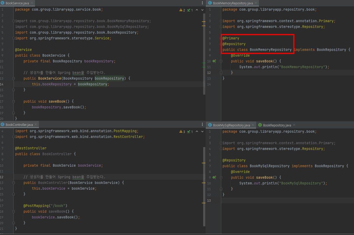 * 단, BookService, BookMemoryRepository, BookMySqlRepository 모두 Spring bean 이여야 한다.