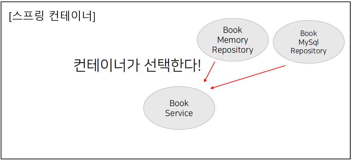 - 즉, Spring Container가 BookService를 인스턴스화 할 때 (BookMemoryRepository와 BookMySqlRepository) 중 어떤 것을 BookService에 넣어줄 지를 Spring Container가 선택하는 것이다.