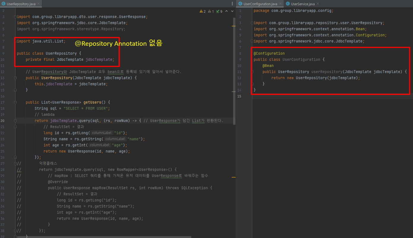 - 위의 UserRepository에 대한 @Configuration & @Bean 예시는 보여주기 위해 일부러 수정한 것이다.