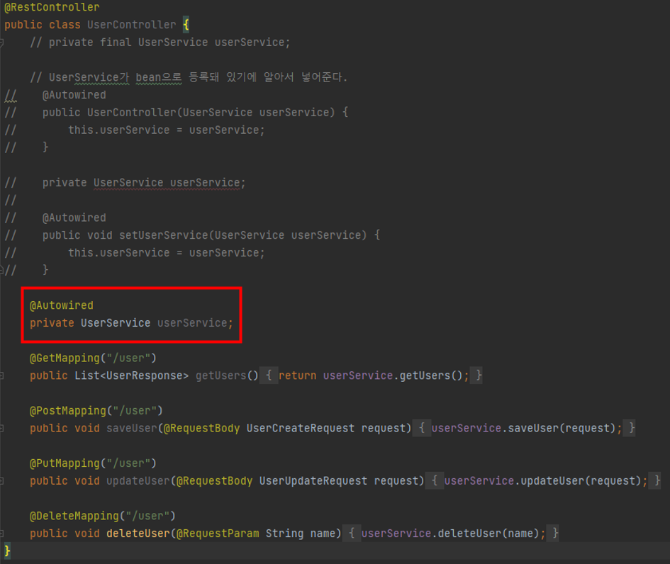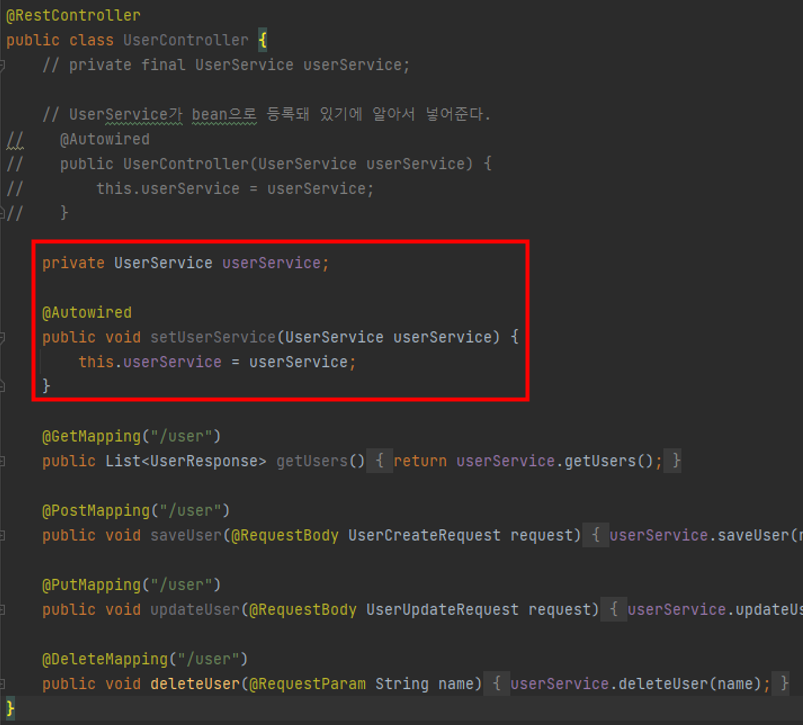 2. 필드에 직접 사용하는 방식 : 테스트를 어렵게 만드는 요인이다.