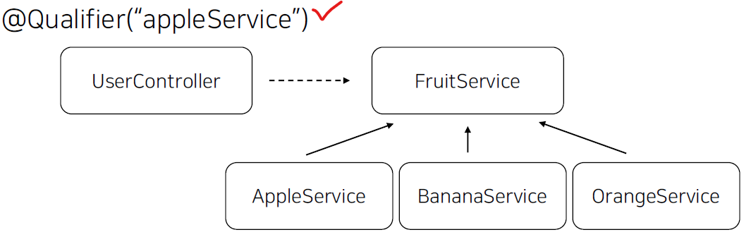 - 이중 UserController가 AppleService, BananaService, OrangeService 중 어떤 것을 주입받을지 어떻게 설정할 수 있을까?