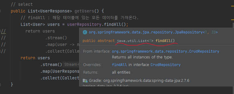 findAll : 주어지는 객체가 매핑된 테이블의 모든 데이터를 가져온다.