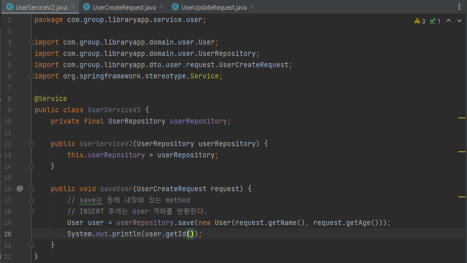 User user = userRepository.save(new User(request.getName(), request.getAge()));