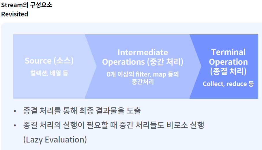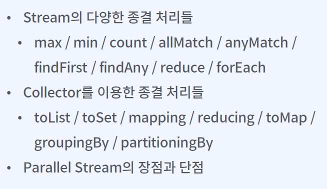 - 종결 처리 : 최종적으로 Stream 안에 있는 데이터들을 모아 반환해주는 역할