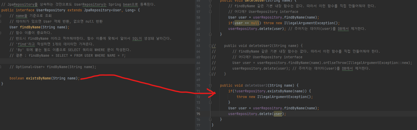 - 함수 이름이 중요하다. 반드시 findByName 이라고 적어줘야한다.(함수명에 맞춰서 알아서 SQL이 생성돼 날라간다.)