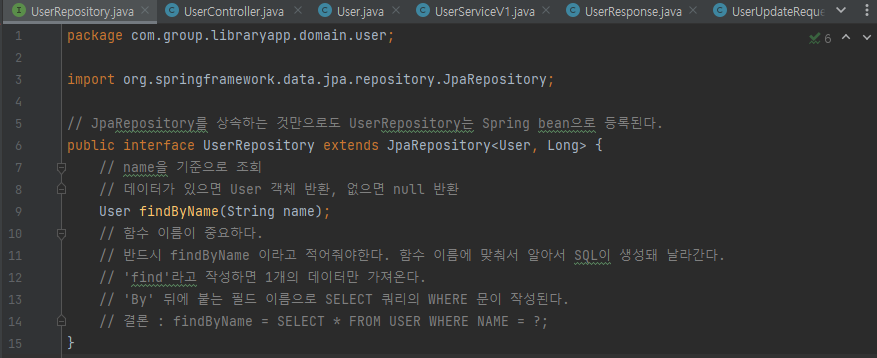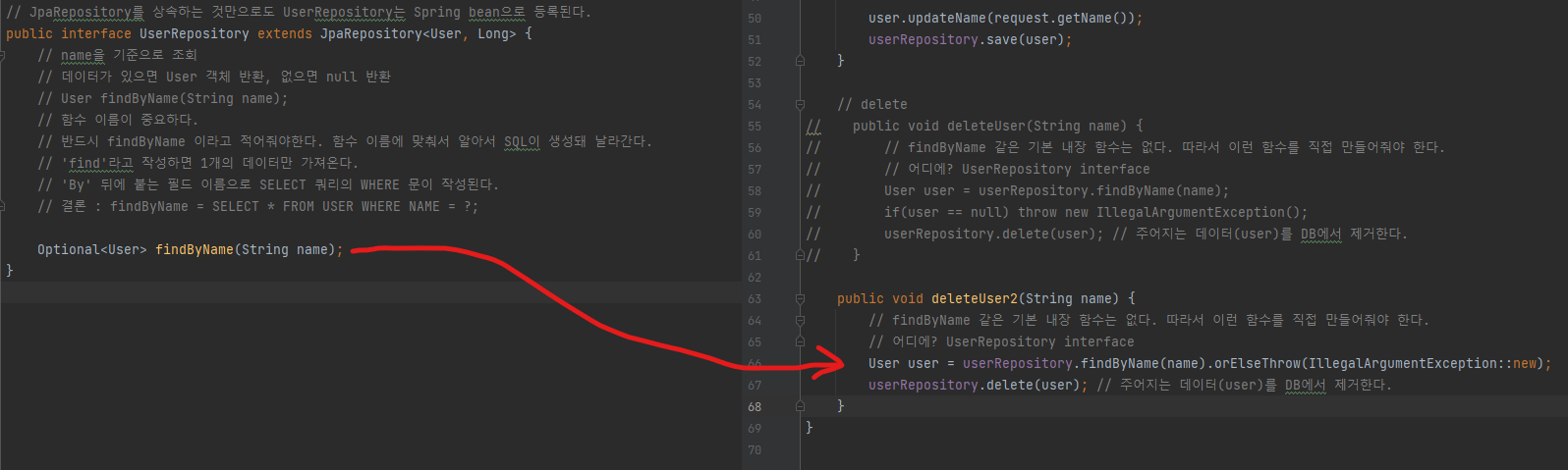 - 결론 : findByName = SELECT * FROM USER WHERE NAME = ?;